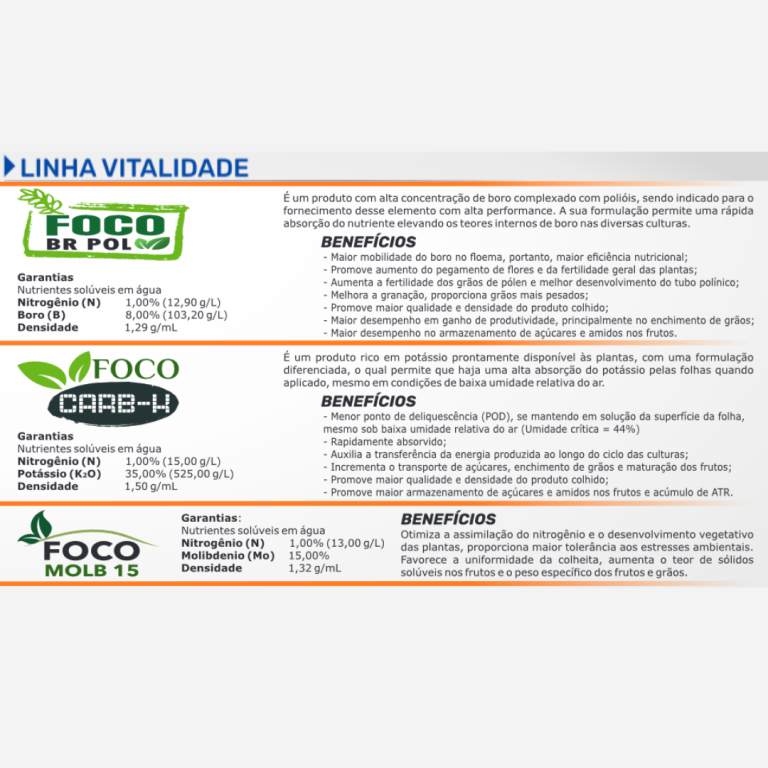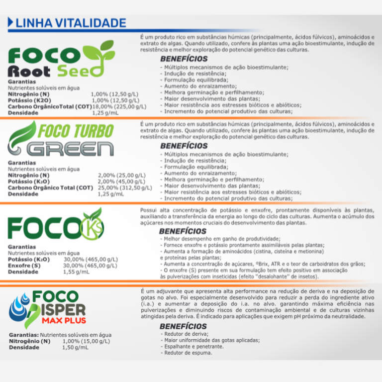 A Fóco trabalha com biológicos microemcapsulados, melhorando siguinificativamente sua durabilidade mesmo fora da temperatura ideal e em condições adversas no campo, garantido que o que é colocado na aplicação é o que vai atuar no combate ao problema. Nossos sanitizantes são de alta tecnologia para garantir a sanidade da sua planta com um efeito residual maior e podendo assim fazer menos aplicações em períodos críticos. Trabalhamos também com microbiologia para disponibilizar nutrientes para sua planta, também com alta tecnologia de microemcapsulamento e condionadores de solo de alto resultado. Somos empresa pioneira na distribuição da Arbolina, acelerado metabólico da planta desenvolvido pela Embrapa, com nanotecnologia para melhor absorção.